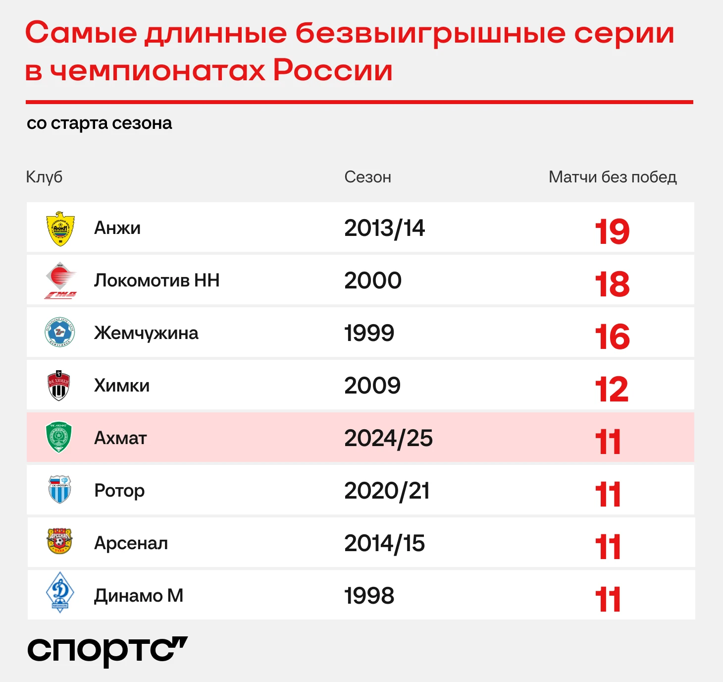 Если говорить только про стартовые 11 туров, команд без побед за этот отрезок в чемпионатах России было восемь. Помимо пяти из таблицы (минус «Волга») – это «Анжи» в 2013-м и московское «Динамо» в 1998-м». «Ахмат» добавился.