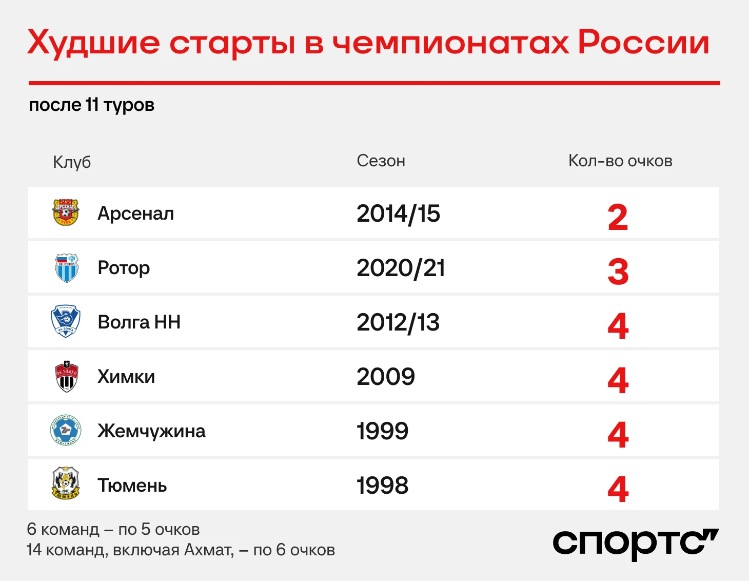 20 команд, включая «Ахмат», в истории российских чемпионатов набирали пять или шесть очков за 11 матчей. Семь клубов набирали четыре или меньше.