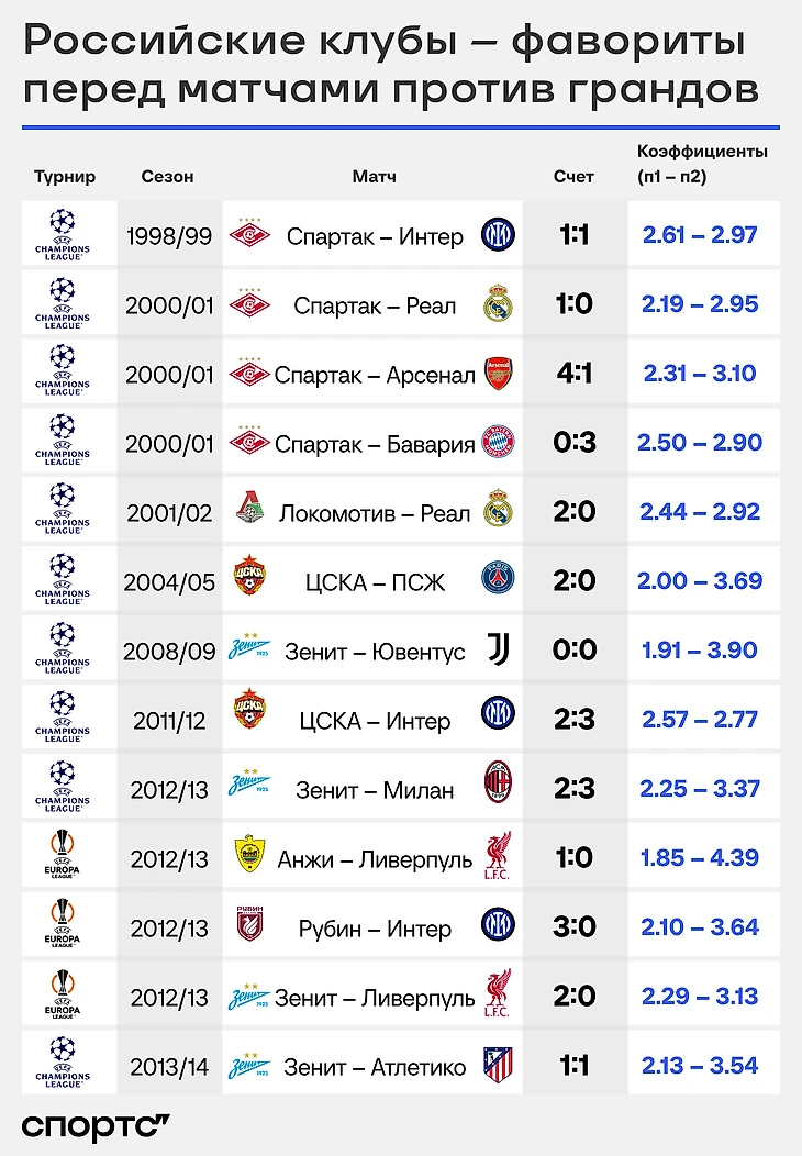 Мы выделили 13 матчей со звучными вывесками, где предматчевые котировки были в пользу команд из России: