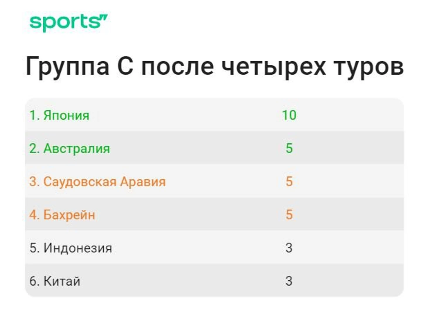 Лидирующих японцев догнать сложно, с двумя соперниками у Саудовской Аравии равное количество баллов, еще у двух команд всего на два меньше. Первые два места гарантируют выход на ЧМ, а третье и четвертое – участие в следующем этапе в борьбе за путевки.