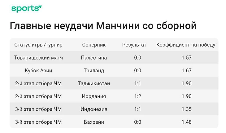 После четырех туров Саудовская Аравия набрала только пять очков. Есть риск не пройти на чемпионат мира, хотя ожидания от итальянца были очень велики – не зря его сделали одним из самых высокооплачиваемых тренеров мира с окладом примерно в 30 млн евро.