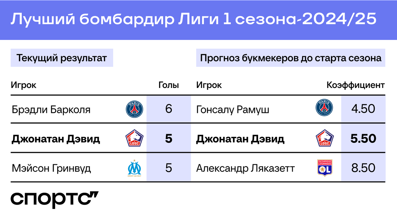 Чемпионат Франции впервые за много лет стартовал без очевидного букмекерского кандидата на лучшего бомбардира – с уходом Мбаппе воцарилась анархия. Выбор в пользу Гонсалу Рамуша как главного фаворита казался сомнительным. В итоге португалец получил травму в первом же туре и выбыл на три месяца.