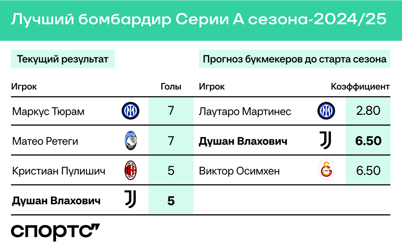 Сейчас лидируют Маркус Тюрам и Матео Ретеги. Причем второй забил столько же, сколько за весь прошлый сезон Серии А. Так что Ретеги вообще был далек даже от топ-10 фаворитов. А вот Тюрам котировался шестым за 25.00.