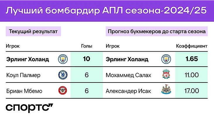 В АПЛ Эрлинг Холанд несется к третьей «Золотой бутсе» подряд – как и предсказывали букмекеры. До старта сезона отрыв первого фаворита от второго по кэфам был самым большим в топ-5 лигах Европы – 1.65 у норвежца против 11.00 у Мохаммеда Салаха. Третьим котировали Александера Исака, у которого пока один гол в текущей АПЛ. Любопытно, что в тройке фаворитов не было Коула Палмера – второго бомбардира прошлого сезона, между прочим.