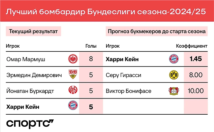 Перед стартом сезона Харри Кейн получил кэф 1.45 – самый низкий на лучшего бомбардира в топ-5 лигах Европы. Но первый в Бундеслиге сейчас не он. Больше всех забил Омар Мармуш из «Айнтрахта» – 8 мячей в 6 играх. Причем у Мармуша на 3,9 гола больше ожидаемого – сумасшедшая результативность. Логично, что букмекеры ждут спада и дают Омару лишь 11% на победу в бомбардирской гонке Бундеслиги.