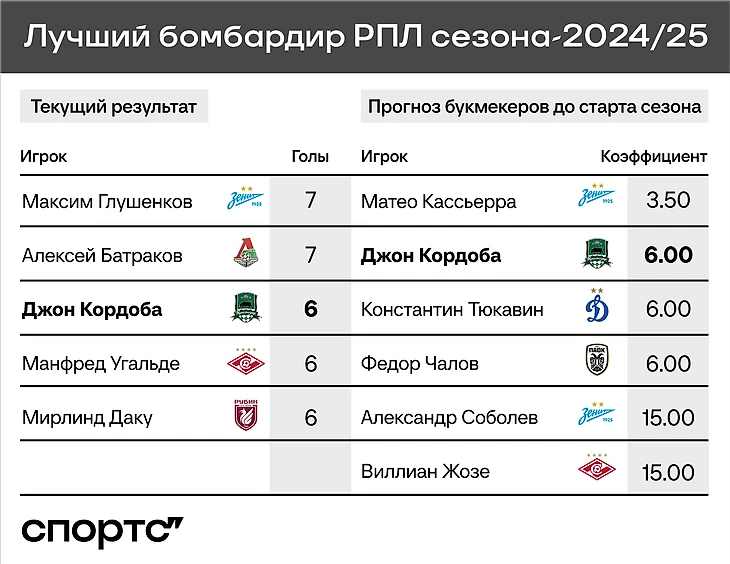 Главным же фаворитом котировался Матео Кассьерра. На Джона Кордобу и Константина Тюкавина давали по 17%. Такие же шансы были и у Федора Чалова (в случае, если бы он никуда не уехал). Намного дороже оценивали Александра Соболева (7%). На тот момент уже активно обсуждали возможный переход форварда из «Спартака» в «Зенит». Но тогда мало кто верил, что трансфер действительно состоится.