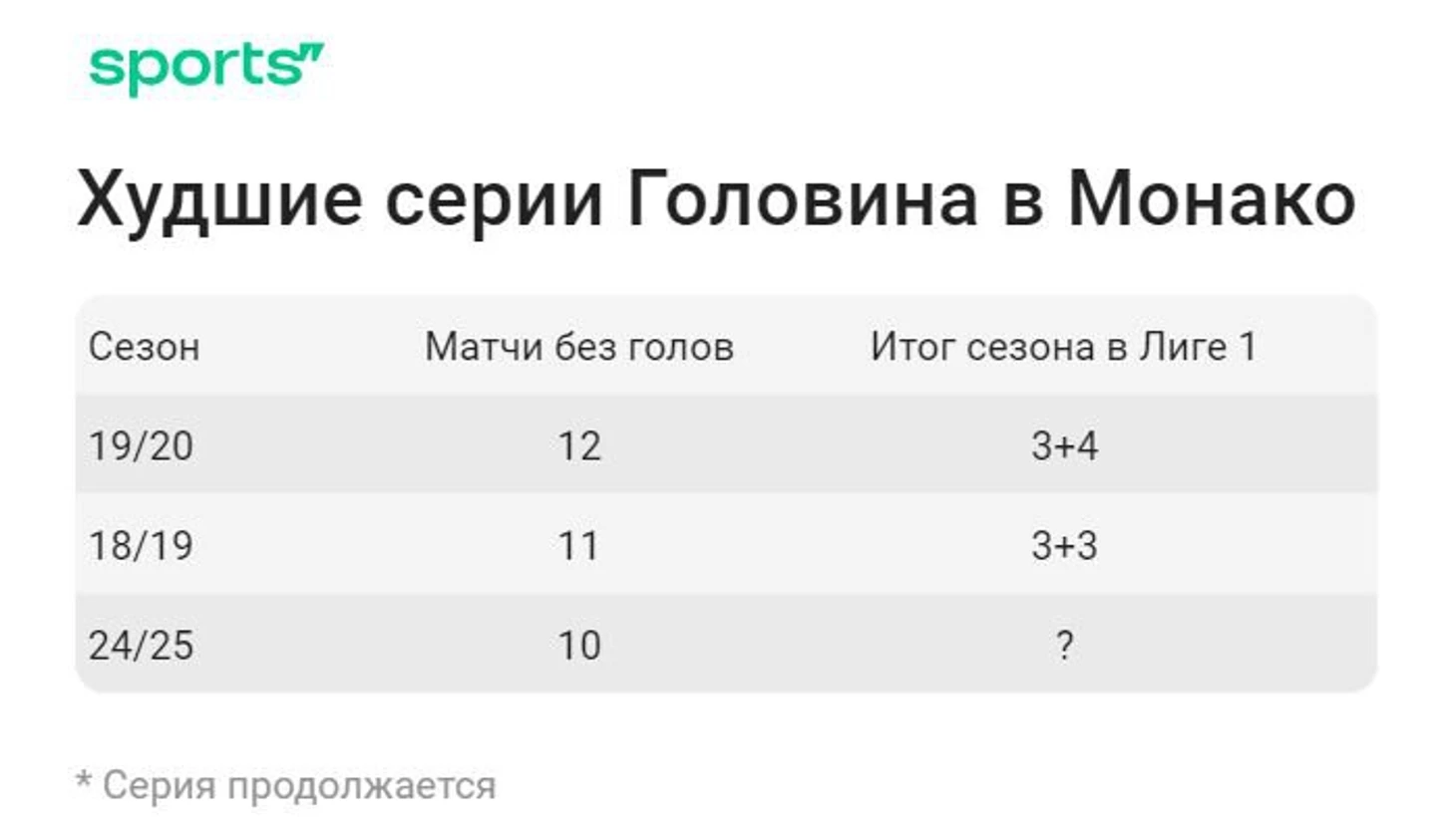 Настолько черных серий у Александра в Европе не случалось достаточно давно, но десять матчей – пока не антирекорд. В сезоне-2019/20 Головин не забивал и не оформлял передачи 12 игр подряд; 11 встреч набегало и в первый год во Франции.