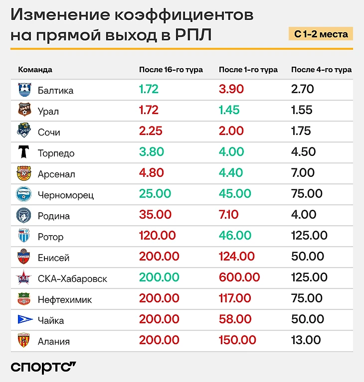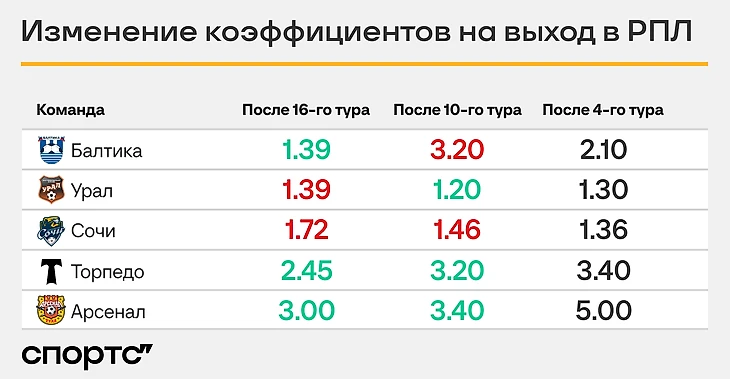 Перед сезоном букмекеры записывали в первую шестерку помимо «Урала», «Балтики», «Арсенала» и «Сочи» (которые там и есть) – «Родину» и «Аланию». Вместо них сейчас здесь «Торпедо» и подтянувшийся «Черноморец».