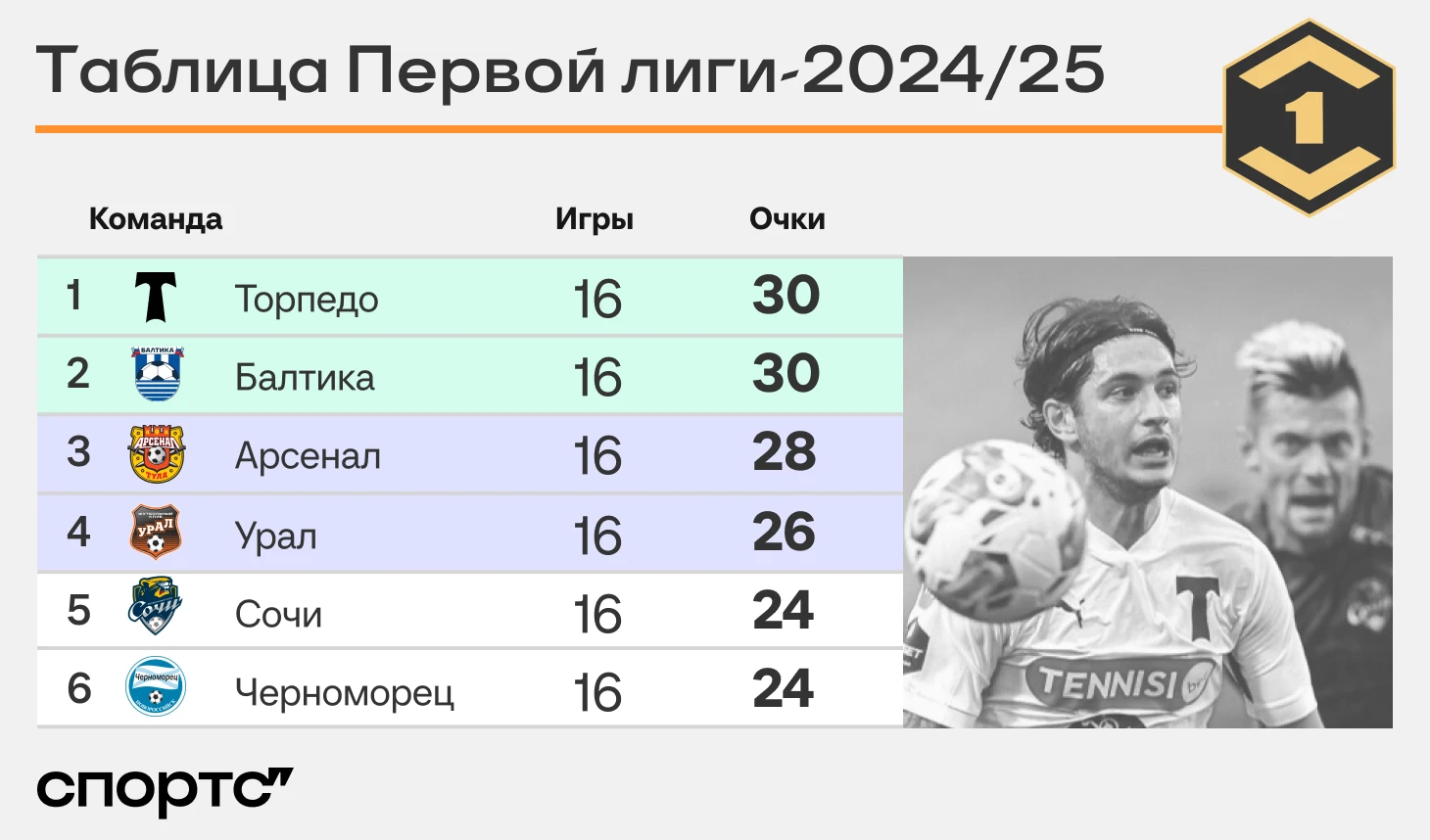 Последний тур первого круга – на выходных. Пятеро из первой шестерки сыграют дома: «Торпедо» – с «Аланией», «Черноморец» – с «Шинником», «Сочи» – с «Нефтехимиком», «Балтика» – со «СКА Хабаровском», а «Урал» – с «Родиной». И только «Арсенал» поедет в гости к «Соколу».