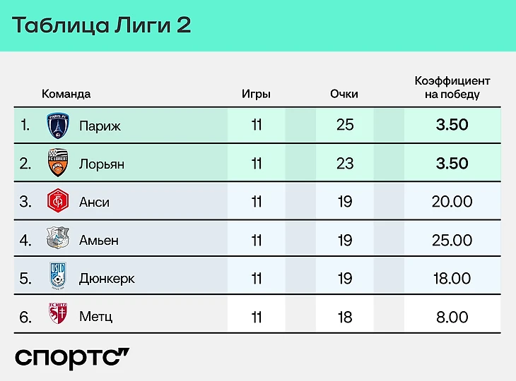 В Лиге 2 – самый скромный состав участников по стоимости игроков среди вторых дивизионов топ-лиг. Выделяется только «Лорьян» – под 70 млн евро; все остальные – не дотягивают и до 30 млн.