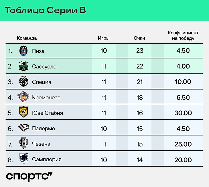 Италия: «Пиза» красуется первой, но мало кто сомневается в возвращении «Сассуоло»