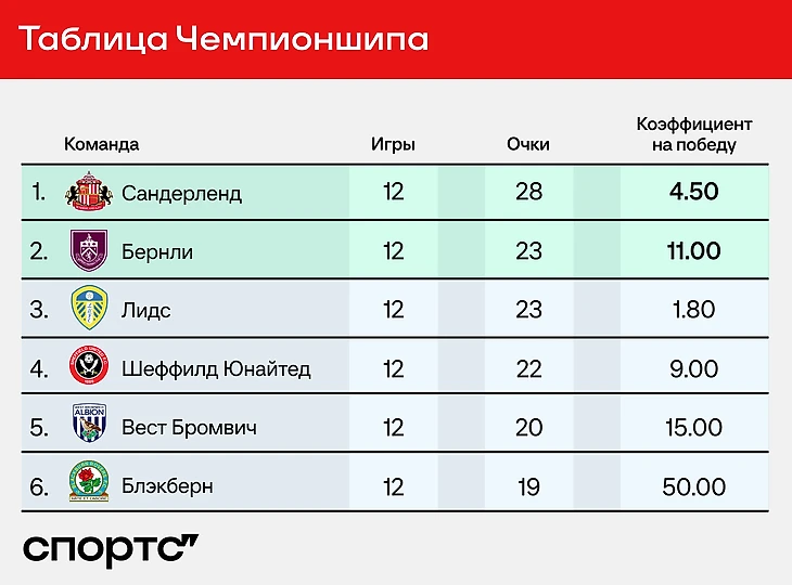 До сезона явным фаворитом на повышение был задержавшийся «Лидс» за 2.75. За клуб до сих пор играют: некогда один из лучших молодых вратарей Европы Иллан Мелье, экс-форвард сборной Италии Деньян Ньонто и бывший футболист «Барселоны» Хуниор Фирпо. Такого набора исполнителей недостаточно, чтобы опережать «Сандерленд».