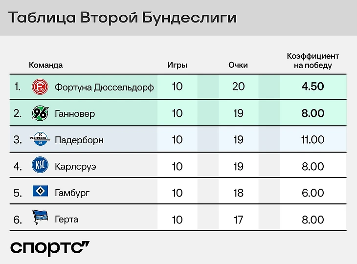 Во второй Бундеслиге в нынешнем сезоне едва ли не самый именитый состав в истории турнира: «Шальке», «Герта», «Гамбург», «Кельн», «Ганновер», «Нюрнберг»… Лидирует пока дюссельдорфская «Фортуна» – в этом нет большого сюрприза. Коэффициент лидера на победу понизился до 4.50.
