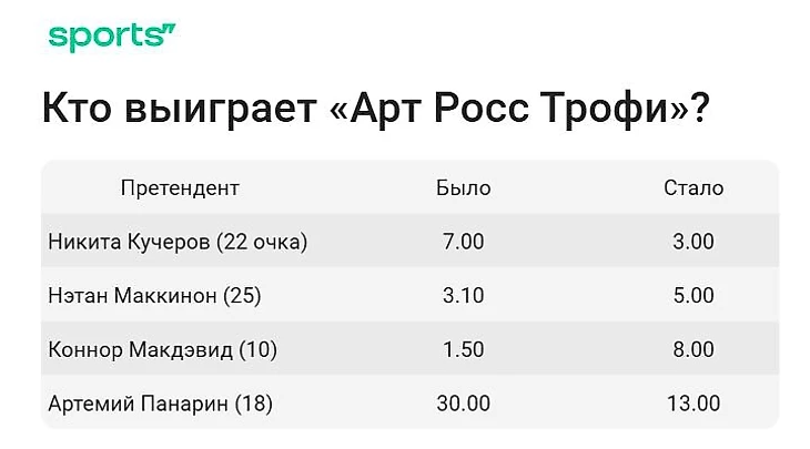 А вот где колоссальные изменения – в гонке бомбардиров. Относительно слабый старт Коннора Макдэвида по очкам спровоцировал его падение в списке фаворитов на третью строчку. Теперь Никита Кучеров – первый в линии на «Арт Росс». Россиянин стоит выше Нэтана Маккинона (3.00 против 5.00). А Макдэвид упал до 8.50, хотя до сезона был оценен за 1.50.