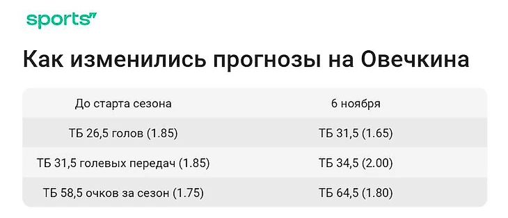 Поменялся в положительную сторону и прогноз на голевые передачи. До сезона Овечкину выдавали тотал на максимум 32 паса, а теперь 2.00 – на 35 ассистов.