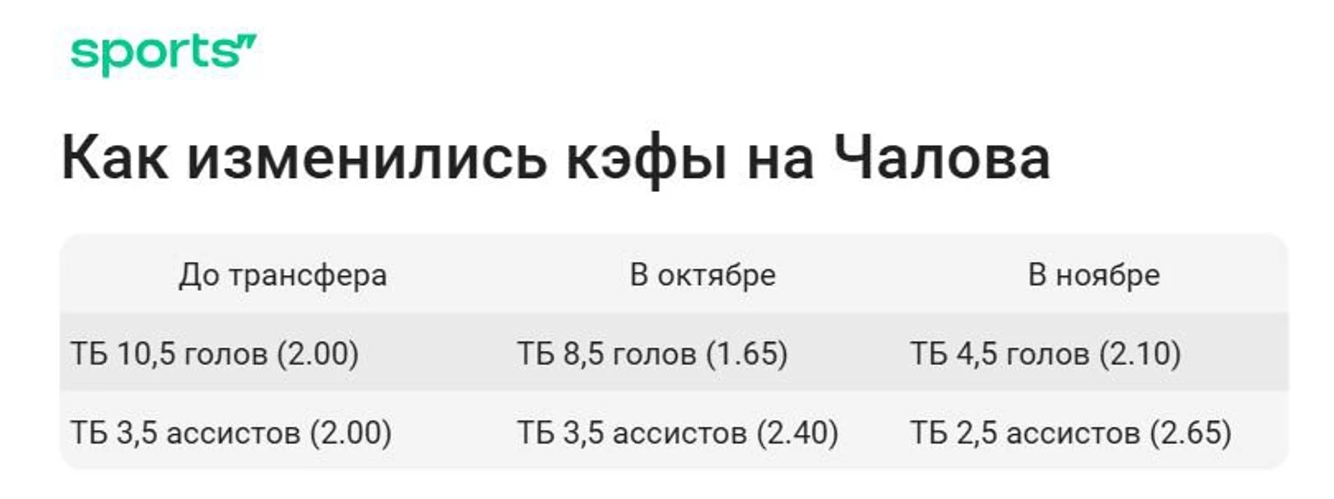 Уже в октябре букмекеры пошли корректировать мнение, индивидуальный тотал Федора понизили до 8,5 голов. С тех пор Чалов так и не убедил, а время идет, гол по-прежнему только один, других результативных действий нет.