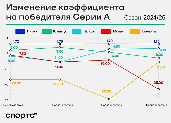 Интереснее отследить изменения именно стартовых топ-5. Практически не менялся коэффициент у «Интера» ни в какую сторону. На «Наполи» чуть взлетал, а потом стал почти в три раза ниже. У «Юве», напротив, его рост. На «Аталанту» нестабильно, а в «Милан» веры становится все меньше.