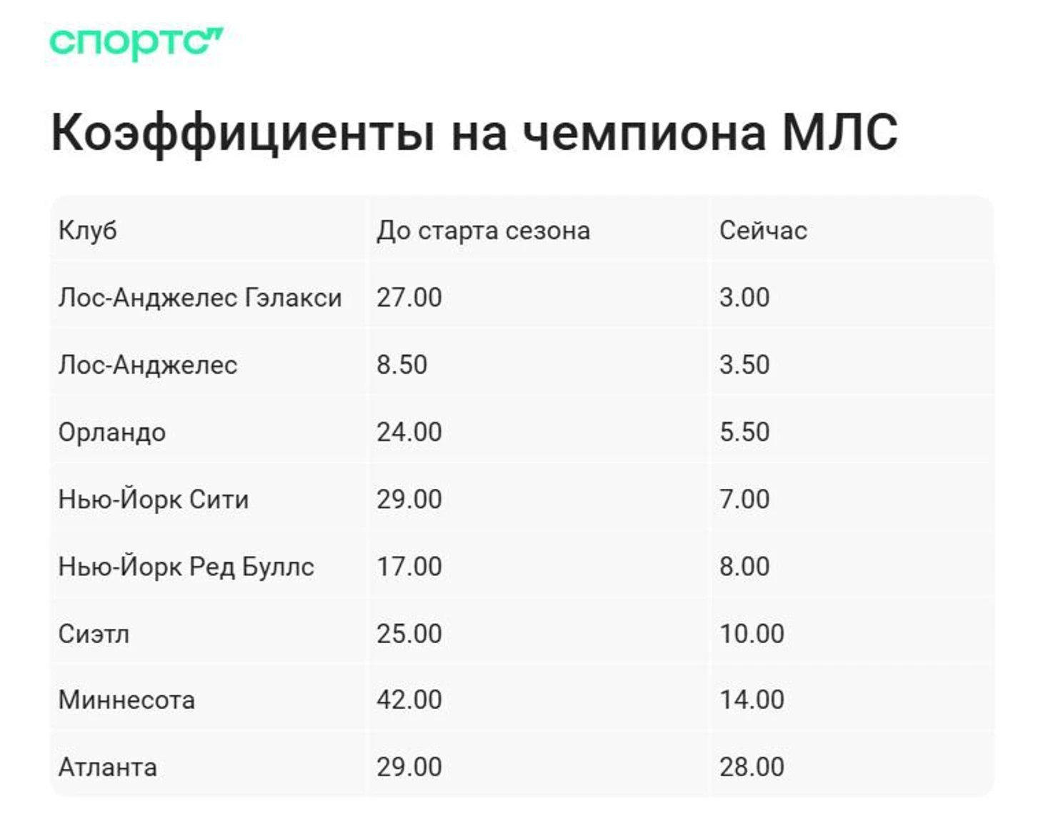 28.00 на «Атланту» – восьмое место из восьми в линии с огромным запасом. «Интер Майами» в роли фаворита заменил «Лос-Анджелес Гэлакси». В тройку входят соседи из просто «Лос-Анджелеса» (3.50) и тот самый «Орландо» (5.50).