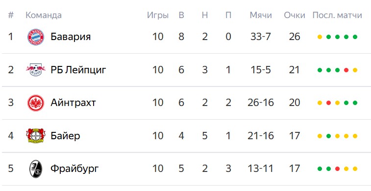 До 8-го тура конкуренты держались рядом, но после 9-го ослабли. Сейчас «Бавария» – единоличный лидер Бундеслиги. Отрыв от ближайшего преследователя – 5 очков. А «Байер» теперь не так прочен – одно поражение и целых 5 ничьих (за весь предыдущий сезон было 6).