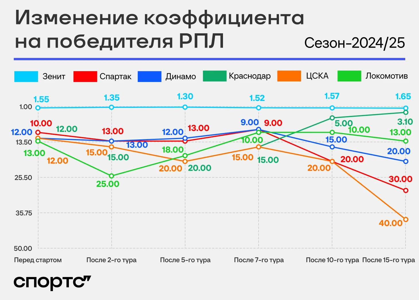 Дальше значения только росли. По сравнению со стартом у «Динамо» коэффициент увеличился почти в два раза, у «Спартака» – в три, у ЦСКА – даже больше, чем в три. Хотя в последних шести турах все трое выиграли по четыре матча.