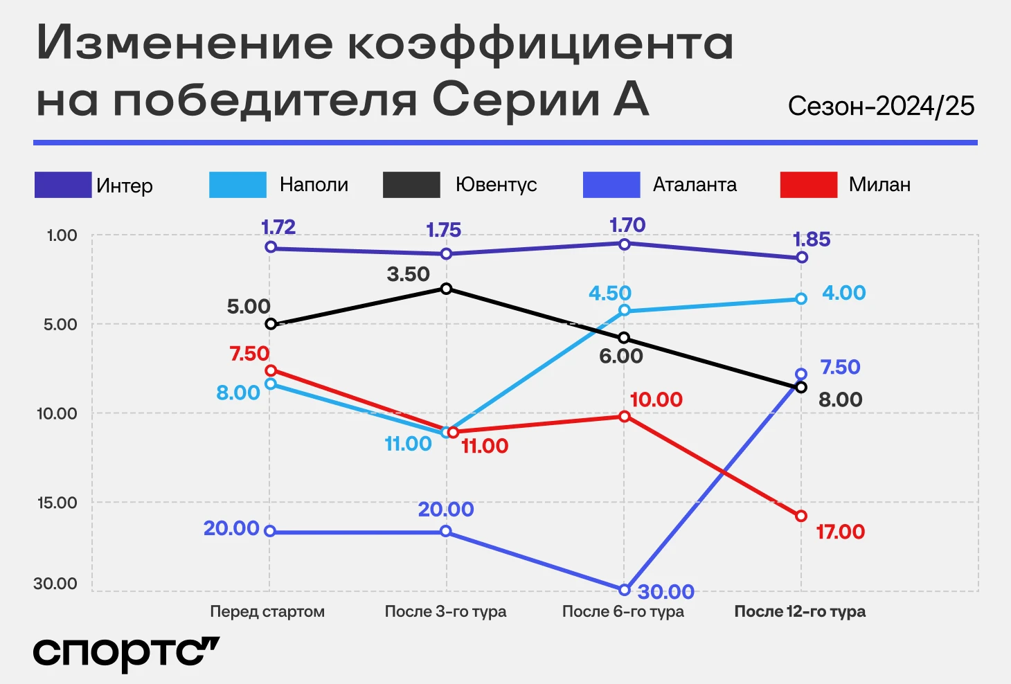 На «Интер» коэффициент чуть подрос, но это до сих пор главный фаворит сезона с заметным отрывом. У «Наполи» падение в два раза, у «Аталанты» – почти в три, а показатель «Юве» стал выше. «Милан» разочаровал букмекеров последними результатами: только две победы за пять туров.