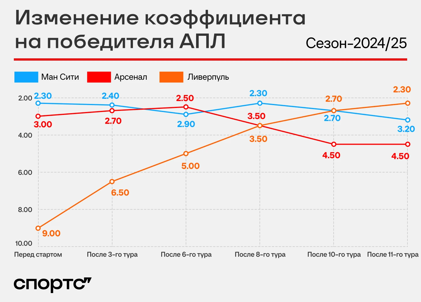 Восемь туров понадобилось букмекерам, чтобы уравнять в шансах «Ливерпуль» и «Арсенал». Десять – «Ливерпуль» и «Сити». Поначалу не очень-то верили в Арне Слота, но сейчас его команду не остановить, а после второй подряд осечки «Сити» в АПЛ главным фаворитом впервые за сезон стал «Ливерпуль».