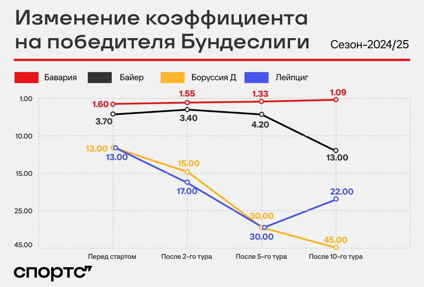 В Германии отыграли 10 туров: «Бавария» набрала 26 очков, «Лейпциг» – 21, «Айнтрахт» – 20. У «Байера» (вместе с «Фрайбургом») только 17, у дортмундской «Боруссии» (и «Униона») – 16.