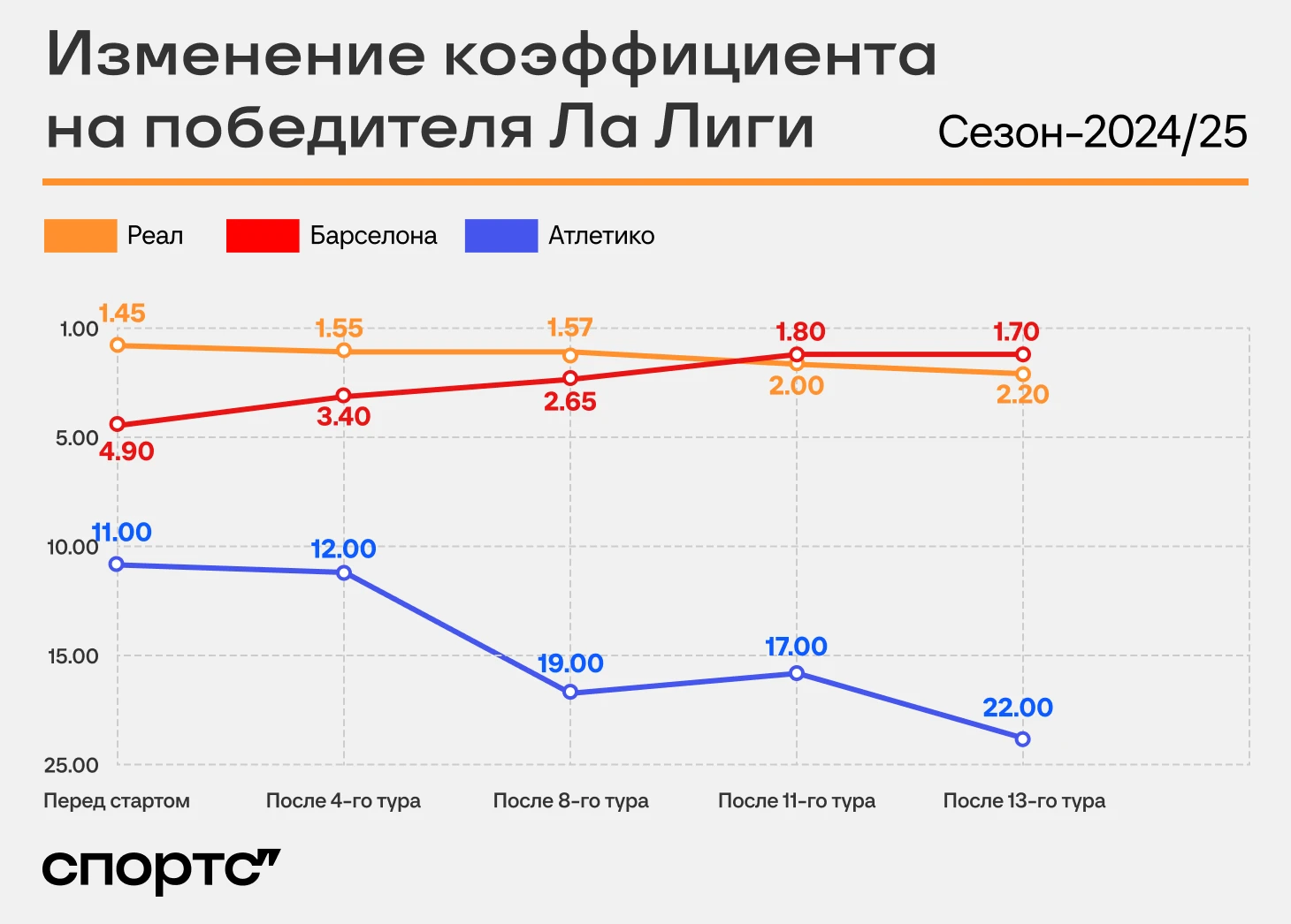 «Атлетико» уже отстает на семь очков, их шансы аккуратно снижались все это время. Другие претендентов нет, ближайший – «Вильярреал» за 200.00.