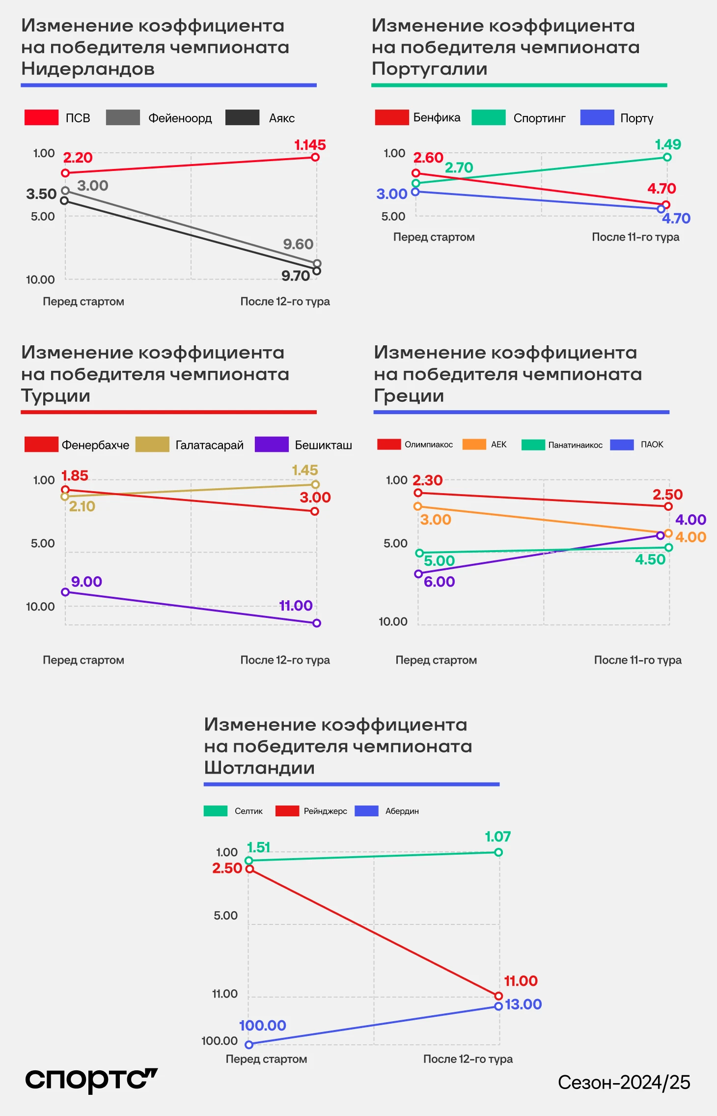 Сравнение позиций в Нидерландах, Португалии, Греции, Турции и Шотландии. Смотрим, что было на старте и как дела сейчас.