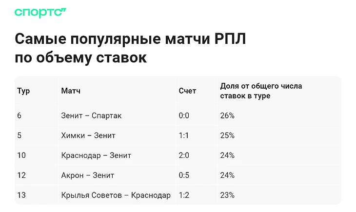 Практически в каждом туре было известно, какая из игр собрала наибольшее количество ставок по сравнению с остальными в процентном соотношении. Главный по интересу в первом круге – матч «Зенита» и «Спартака» в Санкт-Петербурге. Именно он собрал 26% от общего числа ставок в шестом туре.