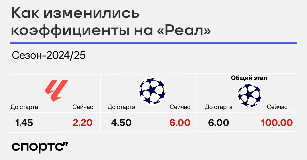 В общем этапе Лиги чемпионов «сливочные» стартовали как вторые фавориты – после «Ман Сити». Спустя четыре тура «Реал» идет на 18-й строчке. Набрал лишь шесть очков. Даже у загребского «Динамо» и «Селтика» больше. Победа мадридцев на общем этапе взлетела до 100.00. А попадание в восьмерку оценивается дороже, чем финиш в зоне стыков за плей-офф (9-24 места) – 3.20 и 1.35 соответственно.