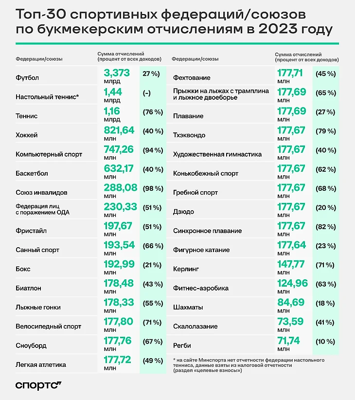 3,4 млрд – футбол, 1,4 млрд – настольный теннис. Сколько букмекеры заплатили федерациям в 2023-м?