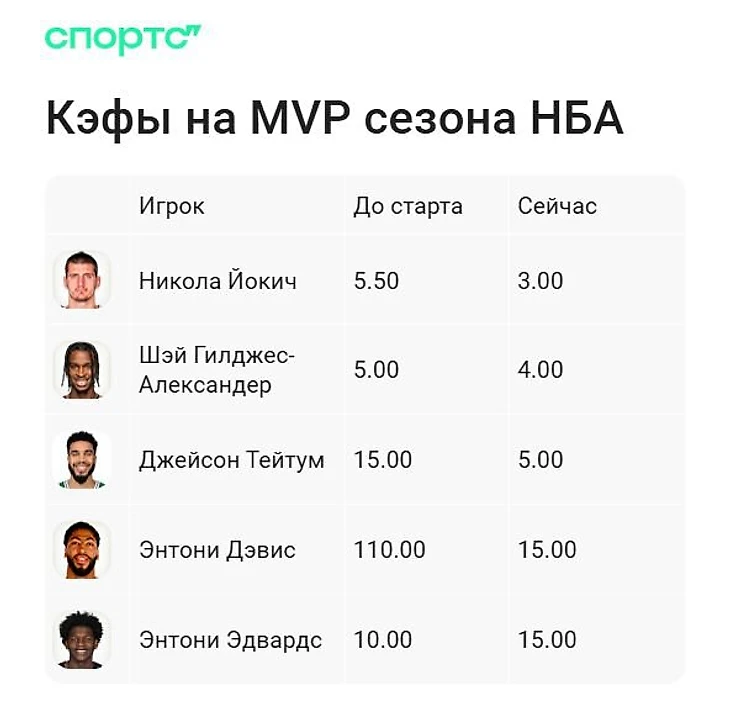 Один месяц регулярного чемпионата срезал шансы почти всех звезд до минимума. В гонке с Йокичем, по мнению букмекеров, остались только Шей Гилджес-Александер и Джейсон Тейтум. Пожалуй, главное событие в линии – крах Дончича. Словенец не просто расстался с лидерством, а улетел за пределы топ-5. Например, сейчас выше лидера «Далласа» ставят Энтони Эдвардса. Дончич оценивается за 18.00.