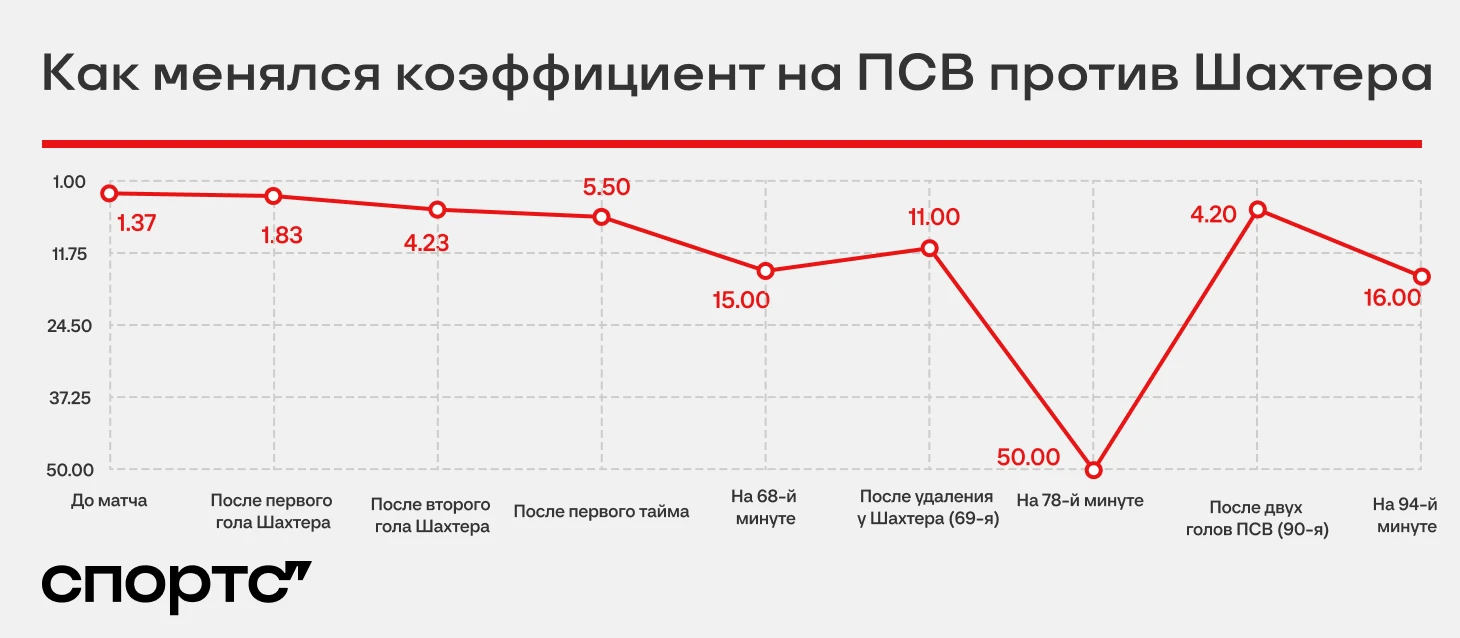 Пока это самый безумный матч в этой Лиге чемпионов – как минимум в плане коэффициентов. Настолько скачущей динамики еще не было. «Шахтер» проделал путь от 10.00 до 1.03, но не выиграл, а ПСВ улетал с 1.37 до 50.00 – и победил.