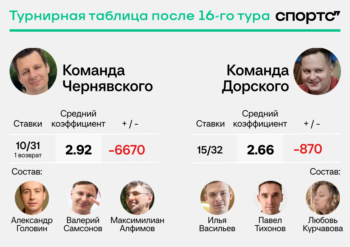 Соперничают две команды главных экспертов по российскому футболу: четверка Глеба Чернявского (Александр Головин, Валерий Самсонов, Максимилиан Алфимов) и дримтим Александра Дорского (Илья Васильев, Павел Тихонов и Любовь Курчавова).