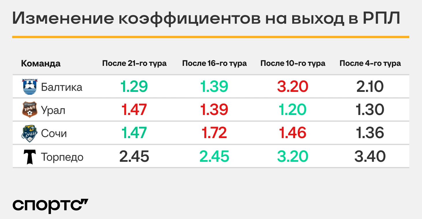● «Урал» и «Сочи» пришли в одну точку, где вероятность 68%. У уральцев она колебалась до 77%, у сочинцев – до 74%. Даже при шестиочковом отставании букмекеры продолжают в них верить.