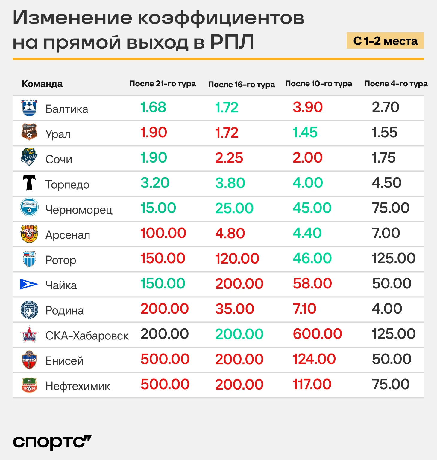 Напоминаем: попасть в РПЛ можно с первых двух мест напрямую или с третьего-четвертого, но через стыковые матчи. Вот что предлагает БЕТСИТИ на выход в элиту и как менялись коэффициенты.