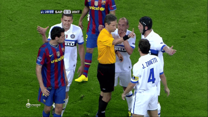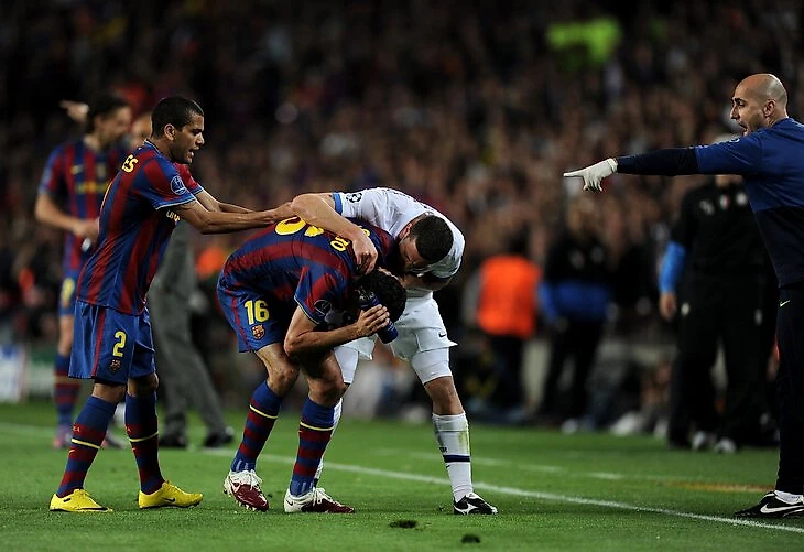А Мотта злился: «У меня нет претензий к судейству. Я был взбешен только поведением Бускетса. Никогда раньше не видел такого, чтобы игрок, которого задели кончиками пальцев, повалился на землю, закрывая лицо руками и поглядывая на арбитра, чтобы удостовериться, что судья видит этот эпизод. Несправедливо, что из-за него я не сыграю в финале Лиги чемпионов. Я и раньше называл футболистов «Барселоны» симулянтами, а теперь даже доказательства этому не нужны».