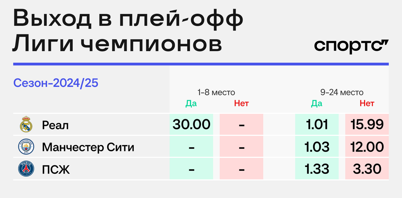 Да, тот случай, когда кэфы на выход в плей-офф «Реала», «Сити» и «ПСЖ» актуальнее котировок на их победу в ЛЧ.