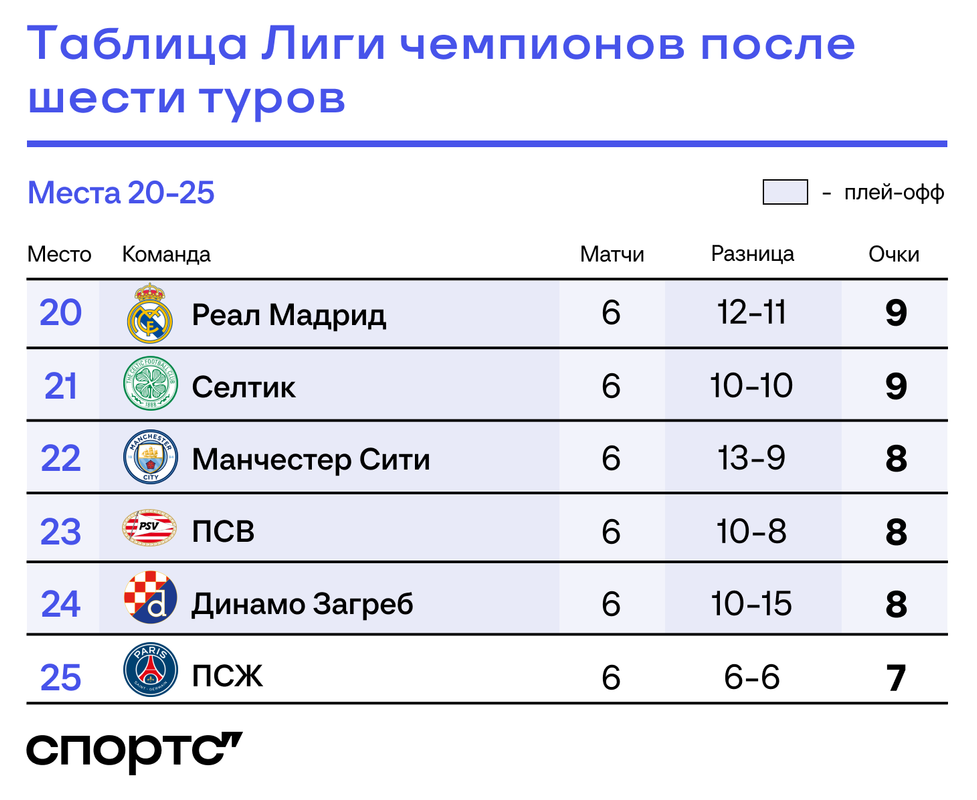 Но больше поражает, что два последних чемпиона ЛЧ, два главных фаворита – «Реал» и «Манчестер Сити» – идут 20-м и 22-м. Выше, например, «Аталанта», «Спортинг», «Монако», «Фейеноорд» и даже «Брюгге». Ну а «ПСЖ» вообще вне зоны плей-офф – 25-я строчка.