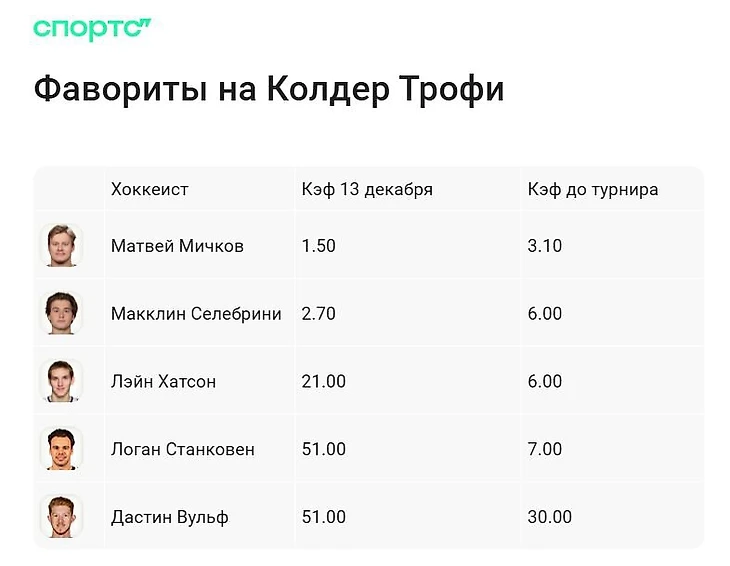 Единственным реальным конкурентом Мичкова по котировкам теперь остается Макклин Селебрини. Форварда «Сан-Хосе» в ноябре вели шестым – главный прогресс за две недели. 18-летний нападающий существенно понизил коэффициенты после матча с «Сент-Луисом»: дубль, ассист, три очка – повторение личного рекорда по результативности в лиге.