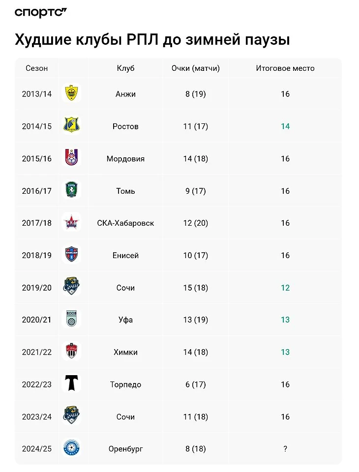 Все остальные команды с последнего места вылетали. В прошлом сезоне «Сочи» не помог Роберт Морено. До этого аутсайдеры чаще всего были обречены либо по игре, либо по финансам. Букмекеры считают, что «Оренбург» уже не спасется – коэффициент 1.20 на прямой вылет.
