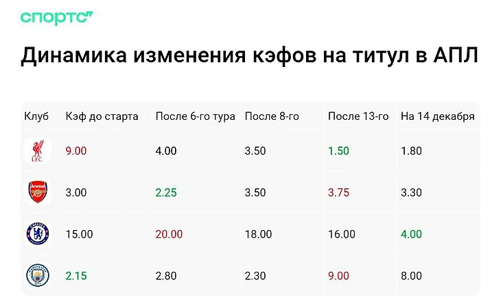 «Ливерпуль» все еще держится уверенным фаворитом за 1.80; «Арсенал» традиционно болтается в диапазоне 3.00-3.50.