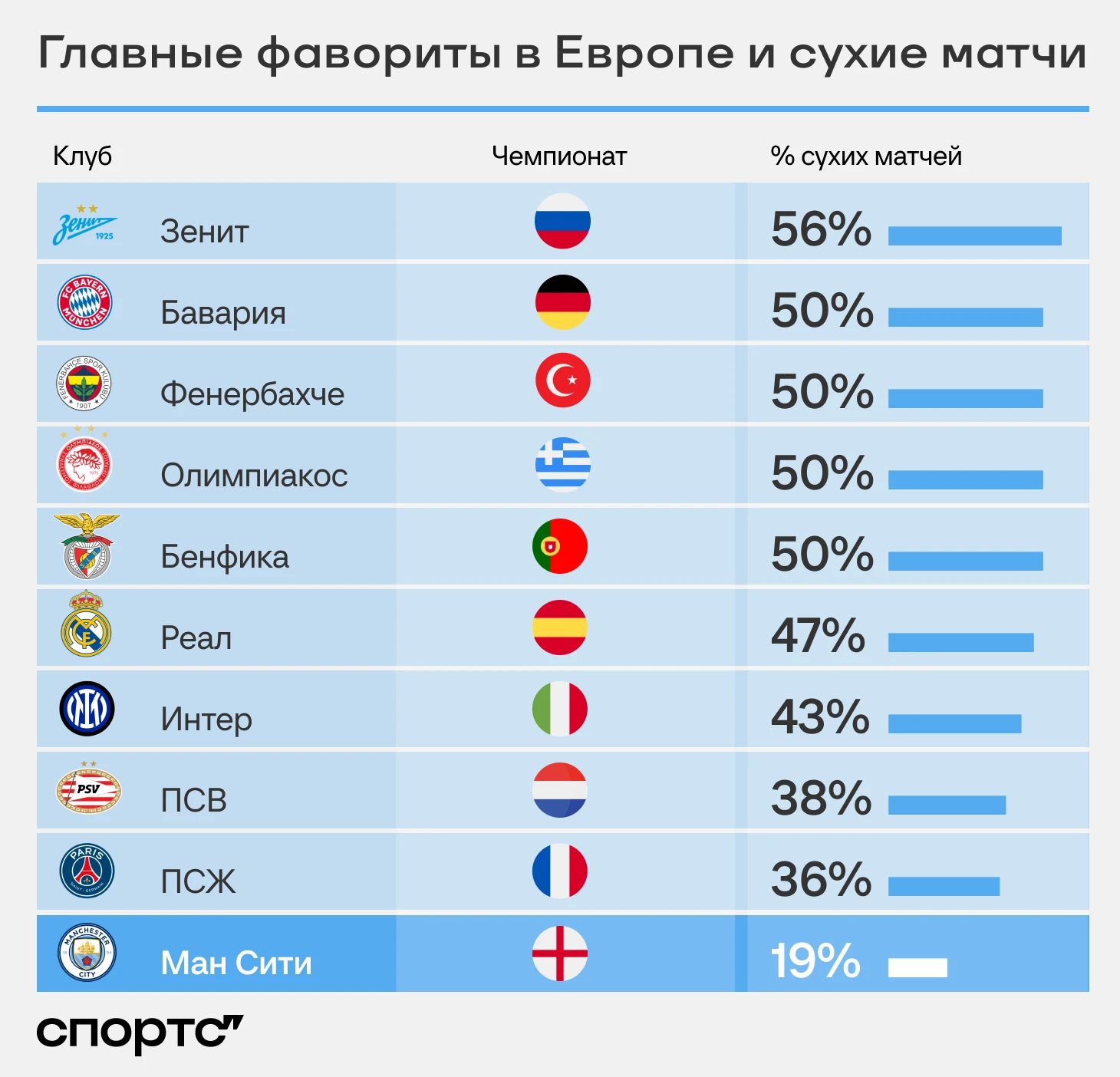 Конечно, стоит учитывать силу лиг, тем более из топ-5 вверху только «Бавария». Но показатель на уровне «Реала» и «Интера» едва ли кого-то бы удивил. «ПСЖ», кстати, ушел недалеко: всего пять сухих игр, хоть и матчей меньше.