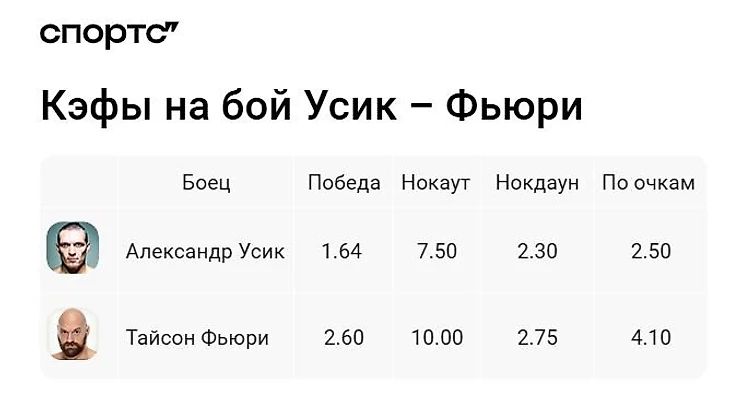 В мае аналитики предполагали нокаут в исполнении Фьюри: коэффициент опускался ниже 5.00, а сейчас достиг отметки уже в 10.00. Интересно, что и нокаут от Усика стал менее вероятен. В мае давали 5.70, сейчас – 7.50.