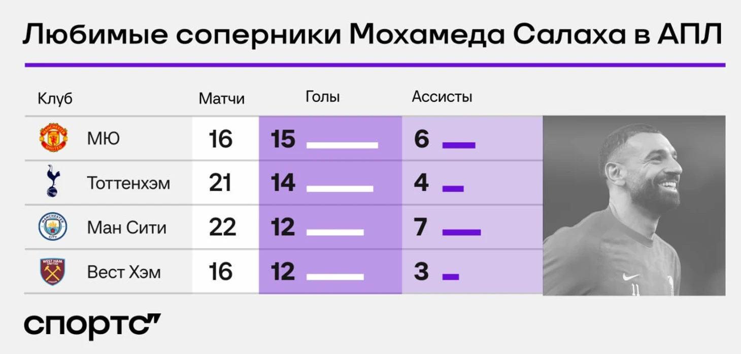 «Тоттенхэм» – очень удобный соперник для Салаха: 14 голов и четыре ассиста, больше «шпор» от египтянина страдали только «МЮ».