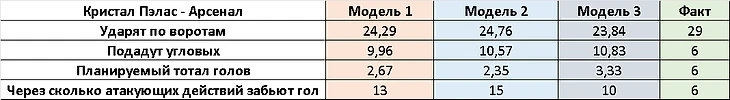 1. Есть прогнозные значения по количеству ударов по воротам и угловым по всем трем моделям.