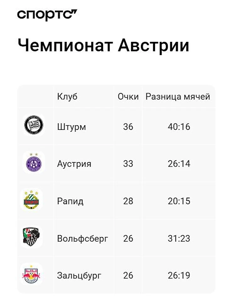 У «Штурма» пока главный конкурент – «Аустрия». Клуб, уступающий по трансферной стоимости российскому «Ахмату», борется за титул после серии из восьми побед подряд. До старта чемпионата команду из Вены не включали в топ-3.