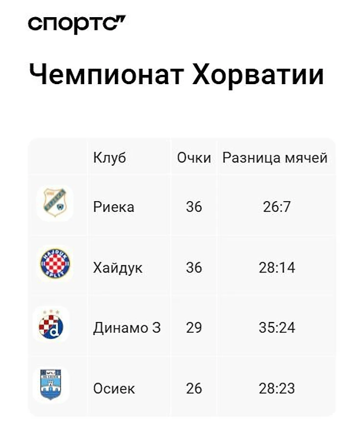 Загреб умудрился потерпеть пять поражений в восемнадцати матчах. А вот скромная «Риека» набирала очки во всех встречах, правда, соотношение не совсем чемпионское – девять побед и девять ничьих.