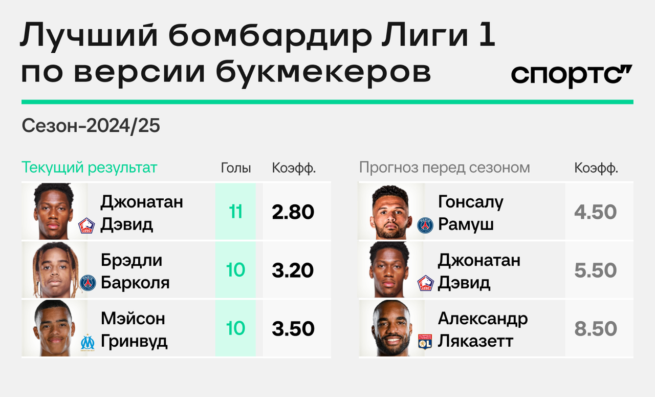 По коэффициентам во Франции пока что самая увлекательная борьба за «Золотую бутсу». Рейтинг бомбардиров с 11 голами возглавляет Джонатан Дэвид из «Лилля». Конкуренты – Брэдли Барколя и Мэйсон Гринвуд, забившие по 10 мячей.